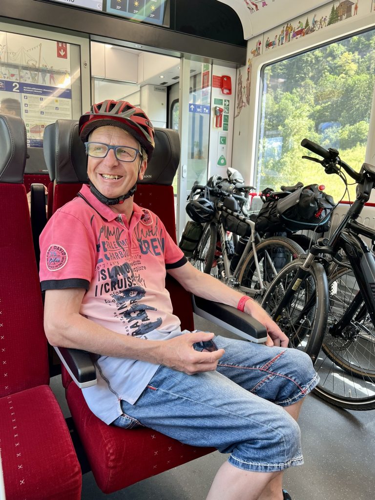 Thomas spricht zum Spaß der anderen Passagiere gleich erstmal über seine Angst vor dem “Ticketdrachen” 🎟️🐲😂 Der ist aber am Ende doch ganz nett und erklärt uns sogar noch, dass es im Moment nur 12 Fahrradplätze im ganzen Zug gibt und das sehr schwierig ist.