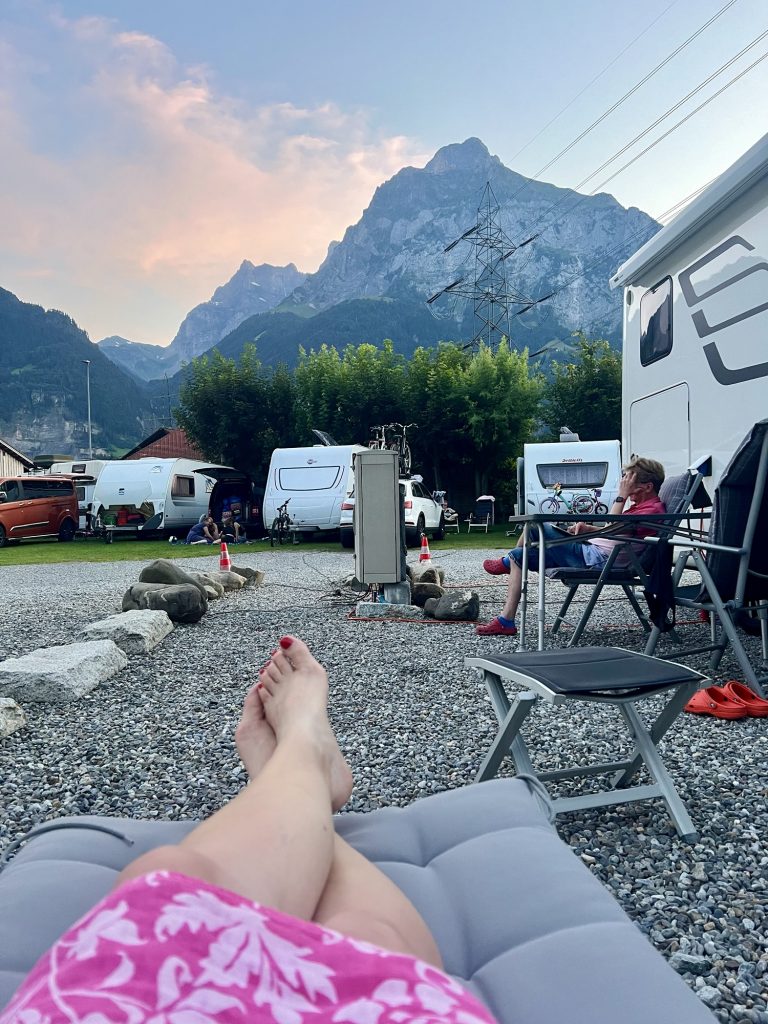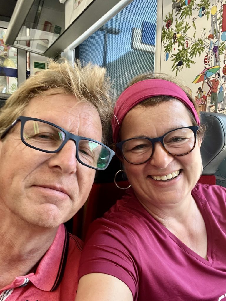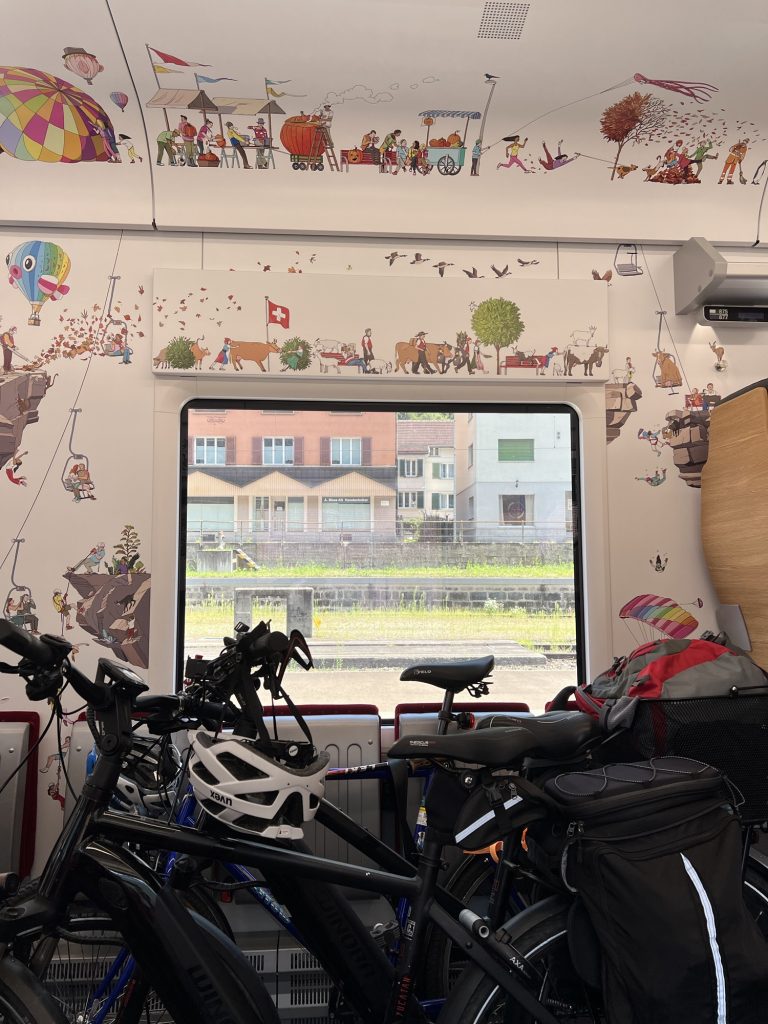 Auf dem Bahnsteig ist dann der Ticketautomat kaputt, also schnell noch die Fahrkarten online kaufen und ab mit den “Velos” in den Zug, nur um dort festzustellen: kein Platz für unsere Räder. Wir müssen im Eingang stehen bleiben und niemand kommt an uns vorbei 🙈