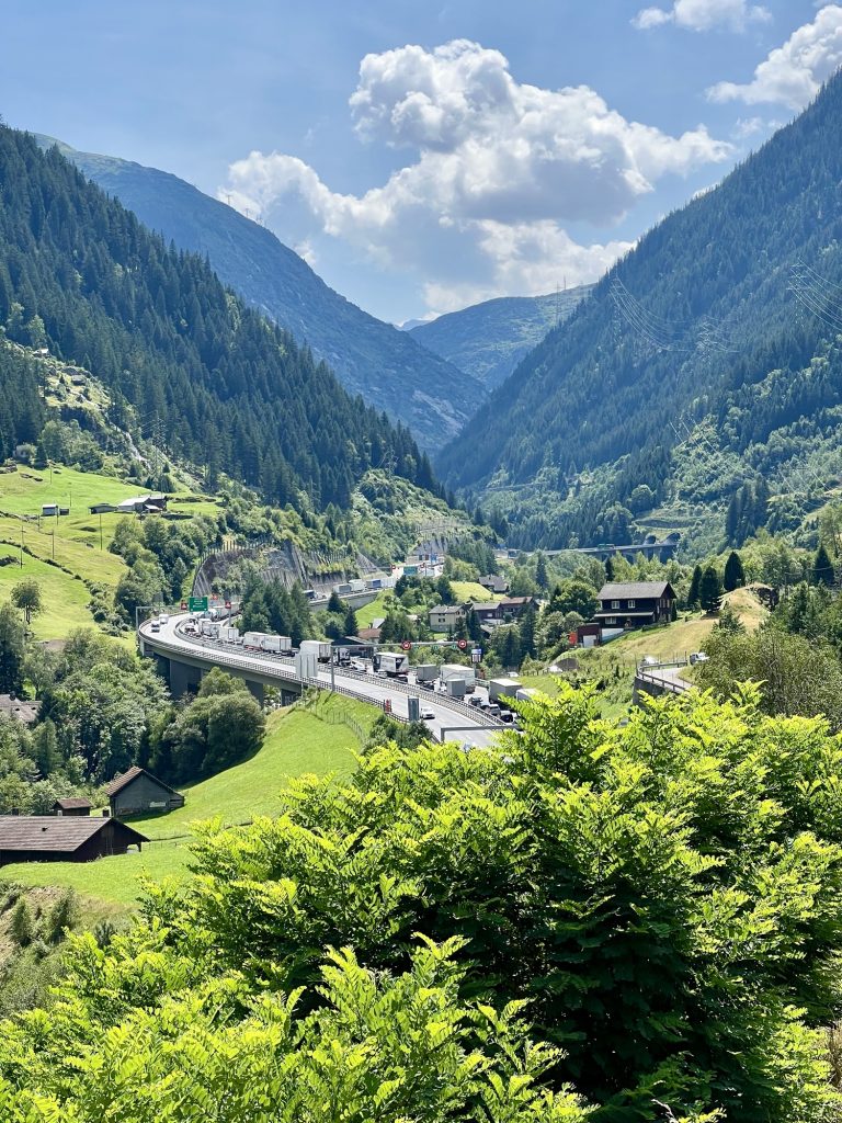 Gut erfrischt und gestärkt geht es weiter, leider auch mit Stau auf der Autobahn und Umleitung über die Passstrasse auf der wir auch mit den Rädern fahren müssen und nicht überholt werden können – mit ca. 50 kmh bergab ist das aber auch besser so.