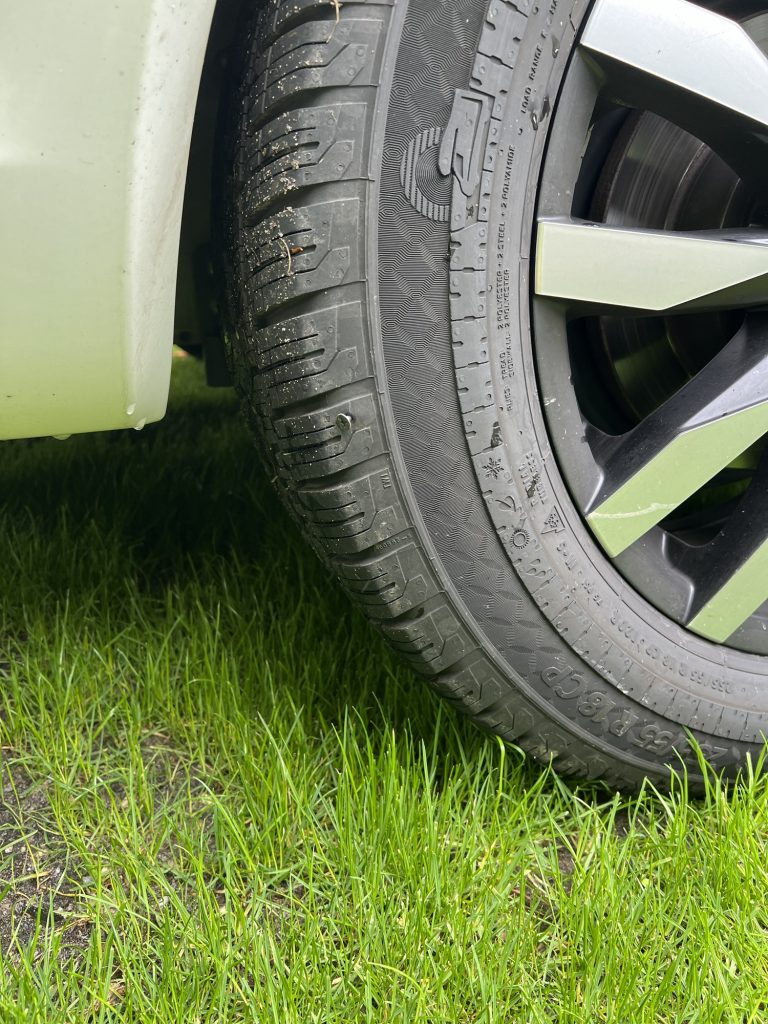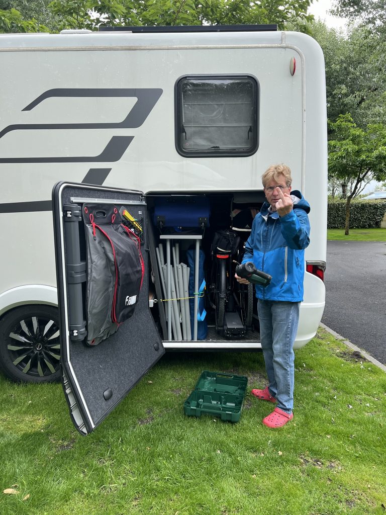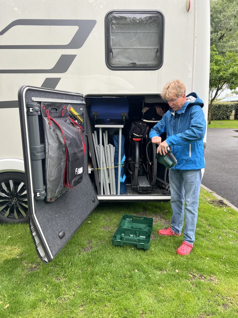 Na ja, das Wohnmobil ist gepackt und wir fahren wie üblich zur Versorgung und da sehen wir es – ein platter Hinterreifen 🙈 Also Wasser tanken 💦, Abwasserentsorgung, Reifen 🛞 möglichst weit aufpumpen und schon geht es zurück zum Stellplatz zur genaueren Untersuchung. Der Übeltäter ist schnell gefunden …