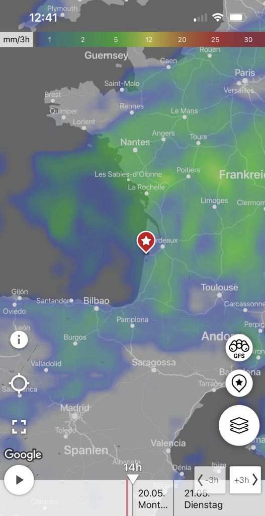 Beim Kaffee ☕️ schauen wir uns die Wettervorhersage nochmal genauer für die nächste Woche an – Regen ☔️, viel Regen, egal wie weit wir schauen, selbst nach Spanien 🇪🇸 runter ist an der Atlantikküste keine Alternative.