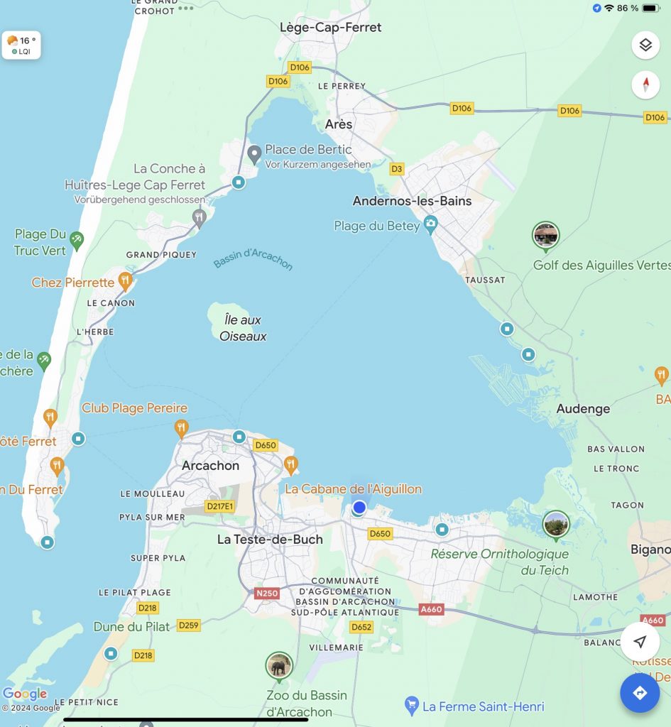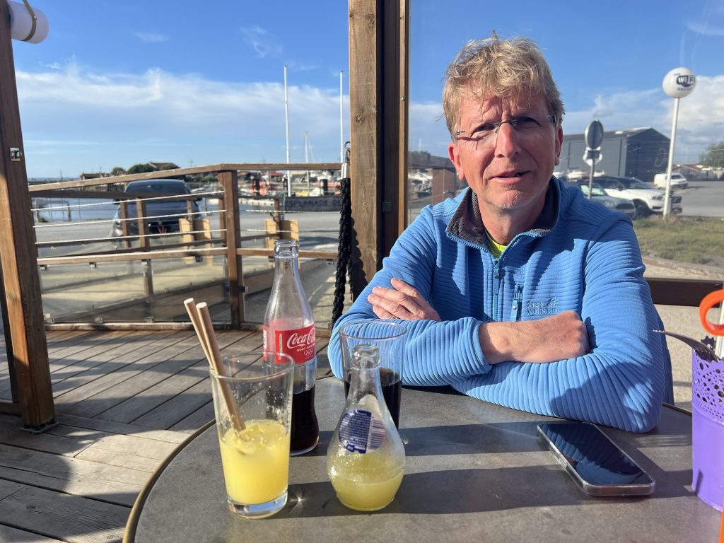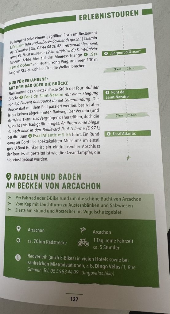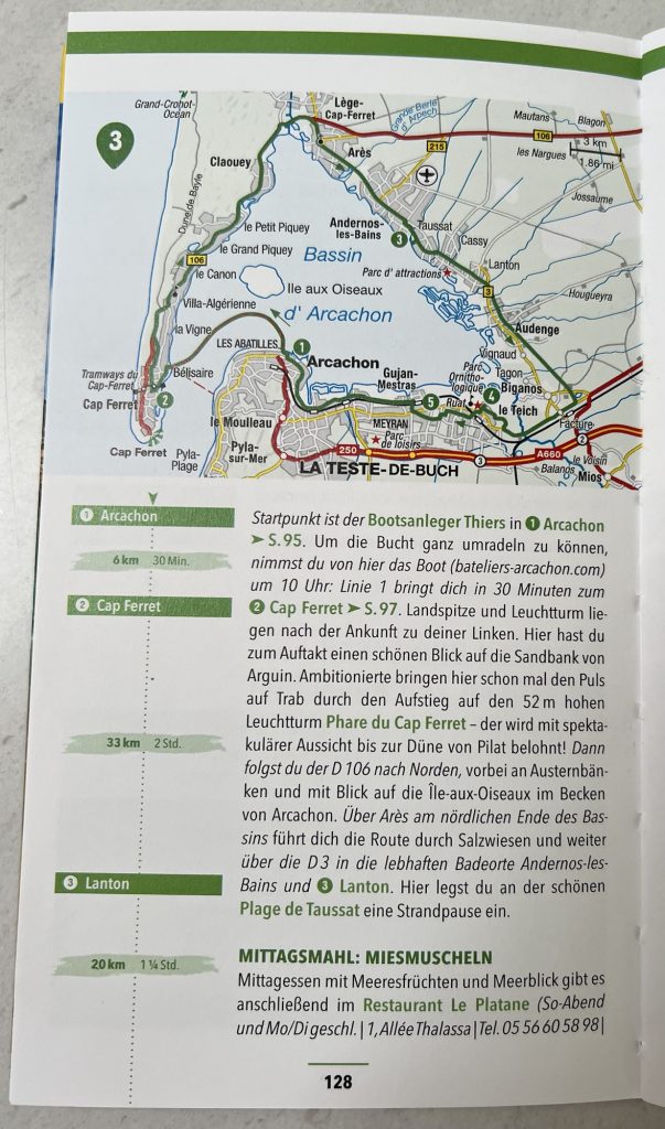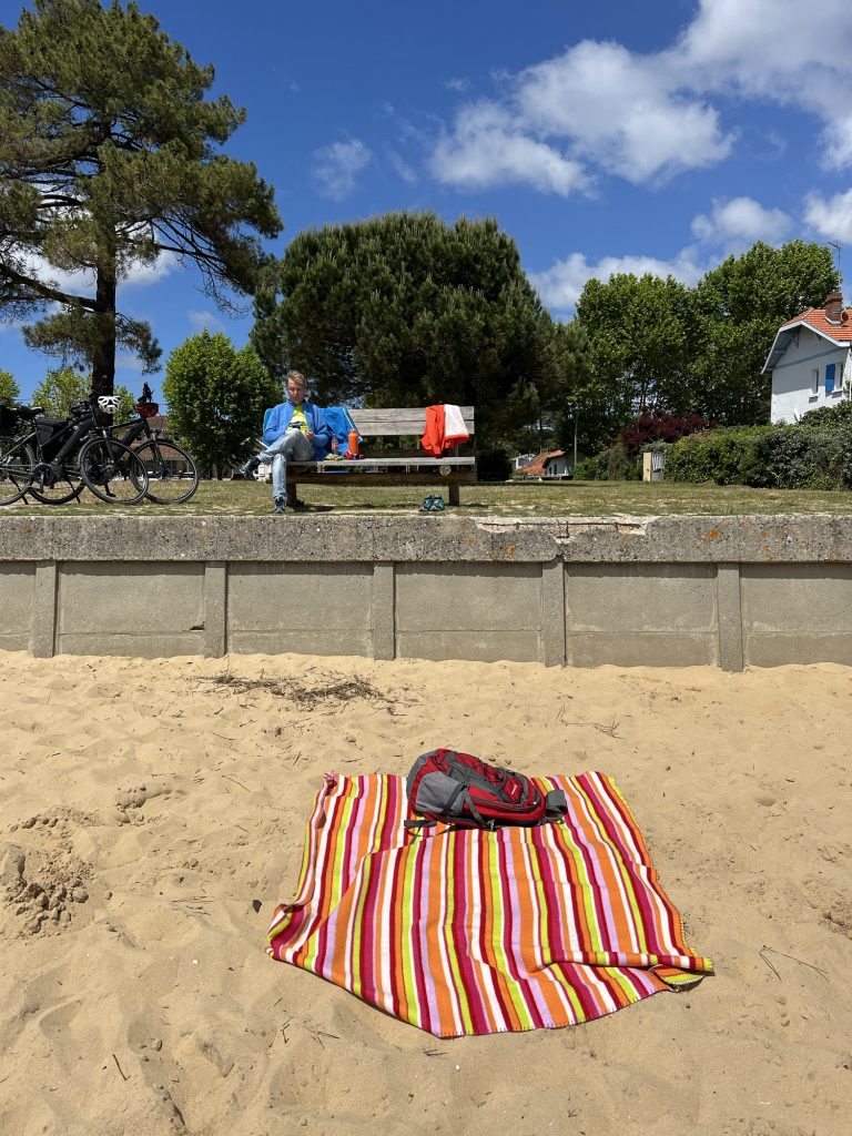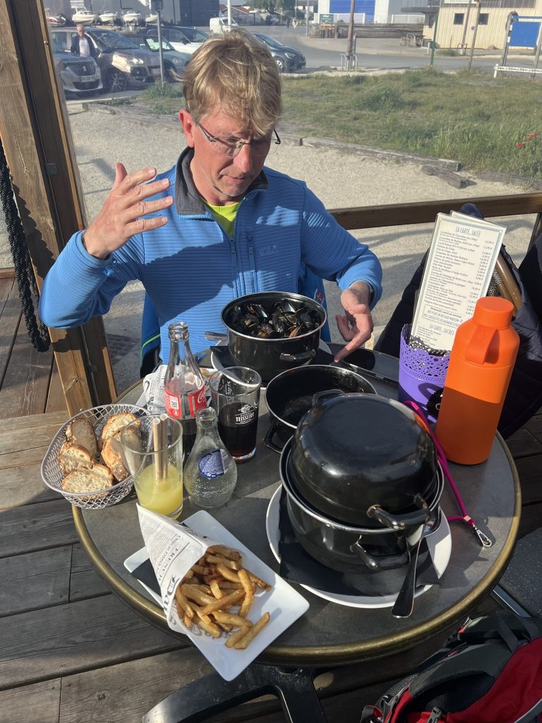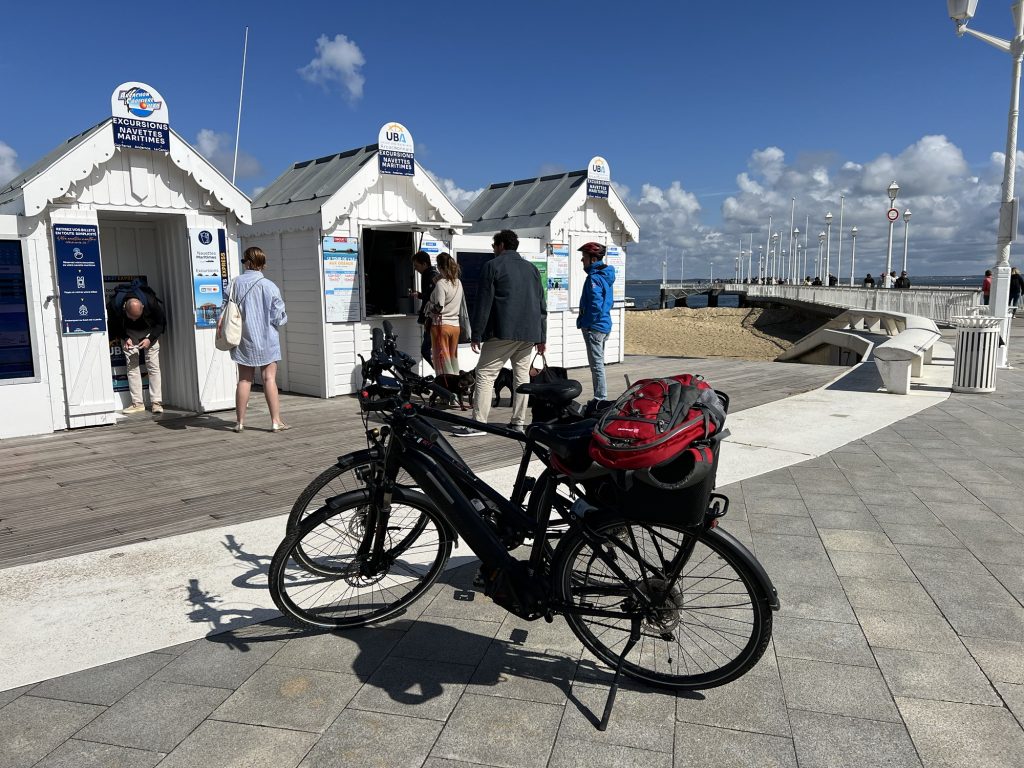 Wir kommen pünktlich in Arcachon an, nur um dann festzustellen, dass die Fähre ⛴️ schon voll ist und wir nur Tickets 🎟️ für die Nächste (12:00 Uhr) bekommen können. Da wir auch noch unsere Räder mitnehmen wollen, sollten wir uns aber trotz Tickets schonmal 30 min vorher anstellen, damit wir überhaupt eine Chance haben. Na das geht ja schonmal gut los, aber wir machen das Beste daraus – Kaffeepause 👍☕️☺️