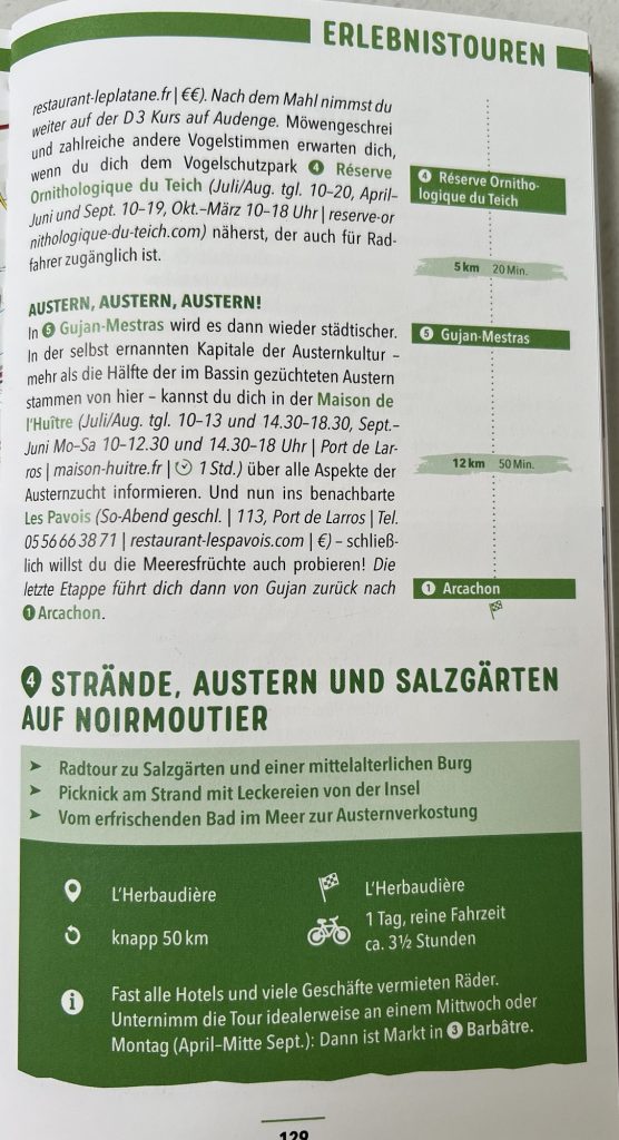 Wenn man einfach “nur” Rad fahren möchte ist die Tour sicher sehr schön, es gibt viele gut ausgebaute Radwege, teilweise eine über 30 km lange, schnurgerade 2spurige Fahrradstrasse mitten durchs Grüne. Wenn man aber die Tour macht um was von der Bucht und der Gegend zu sehen, wird man – wie ich – eher enttäuscht. Cap Ferret haben wir zusätzlich hinzugefügt, das war wirklich toll. Ansonsten muß man jedes mal von der Tour weg Abstecher machen, wenn man etwas von der Bucht, Häfen, Strand oder ähnlichem, sehen will. Das wird bei 80 km aber auch schon eine zusätzliche Herausforderung.